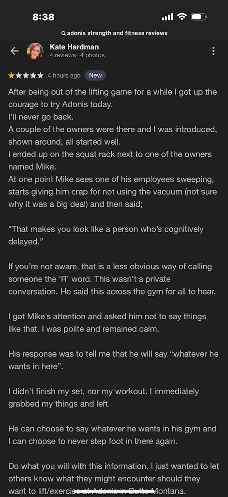 What might be offensive to you isn’t necessarily offensive to others, and you may not realize the respectable relationships he has with his employees that allow for this type of communication. Adonis is a gym where we push each other to be better. Mike sets a high bar, and while his approach might not be for everyone, it comes from a place of wanting to create a no-nonsense environment where people can achieve their goals. We respect that you’ve made your decision, but we stand by the community and atmosphere we’ve built at Adonis.