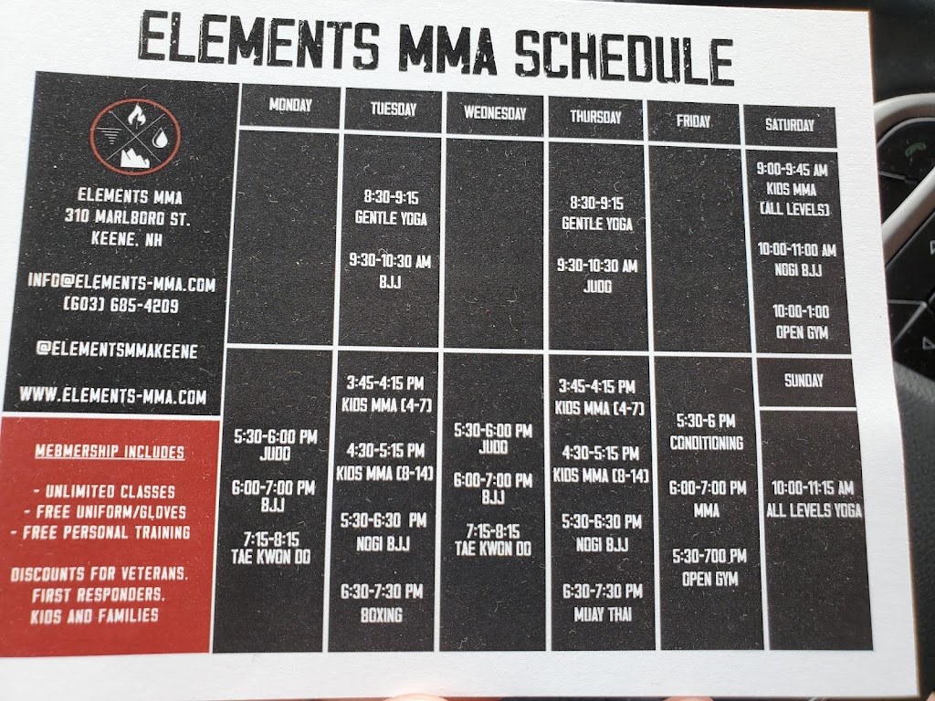 The newest Martial Arts Academy in Keene, NH, Elements MMA offers a holistic approach to marital arts training. At Elements you will have the opportunity to train in a variety of grappling and striking arts to build well rounded skill set. Combine your skills with proper strength, conditioning, and flexibility training, and you will never be out of your element.