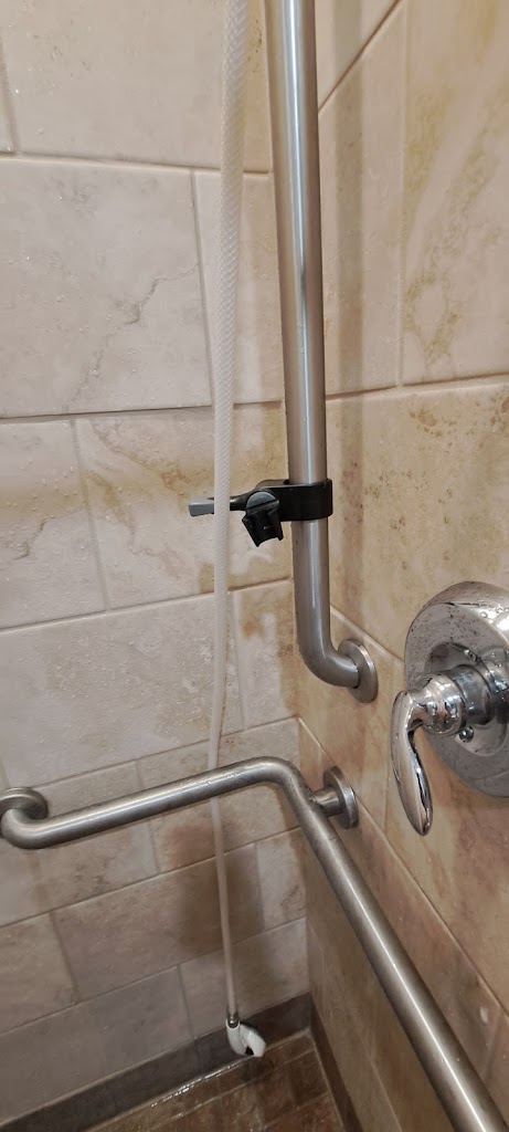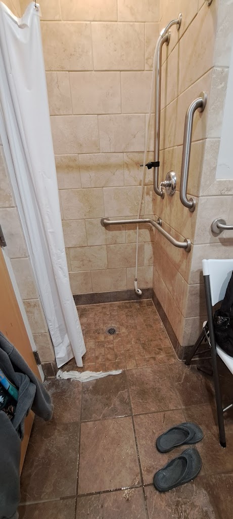 Could have taken less time in the shower had the shower head not been sliding and spinning and soaking half the bathroom floor. Thank goodness for that floor drain and that slot under the door so the water could pool out onto the floor in the hallway.