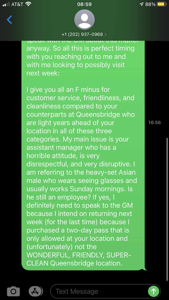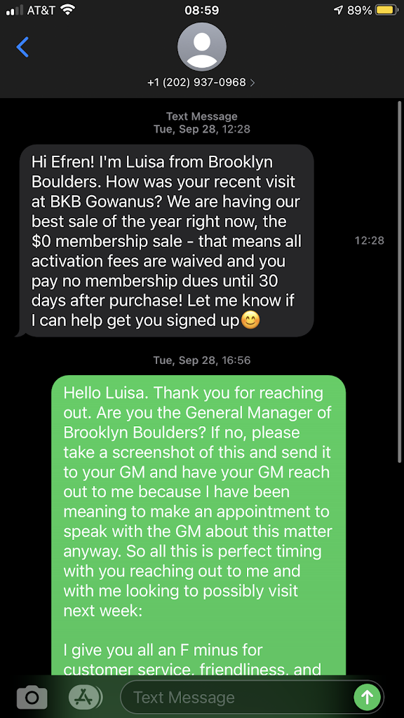 This location doesn't know the definition of customer service. They have an assistant manager (picture enclosed) who has a horrible attitude and is very disrespectful. He is very condescending when he talks to customers and I have seen him running up to climbers while they are being belaying and stopping the person belaying for whatever his reasons are. Does he not realize how dangerous it is for him to be interrupting a climber who is being belay by someone? In the other photo is a screen shot from Luisa, one of their sales reps who contacted me via text message (which I believe I indicated upon signing up that I didn't want to be contacted at all). I responded back to Luisa letting her know my honest opinion about her filthy, dirty and disgusting location and requested for her to forwarded this message to the general manager. Not sure if she ever did or if the general manager got this and ignored me, but I will get to the bottom of this when I finally visit later this week to speak to the general manager.