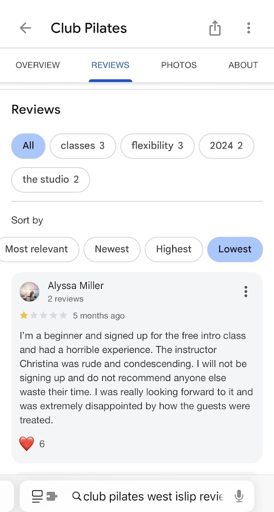 If I could give 0 stars, I would. I was so excited to finally be able to take an intro class that ended up being such a disappointing experience. The instructor was unprofessional, rude, and condescending. As a fitness instructor the goal SHOULD BE to create a space where individuals feel safe, seen, heard and value. Her class environment was anything but that. Attached see a screenshot of a similar negative review about the same instructor, with multiple likes.