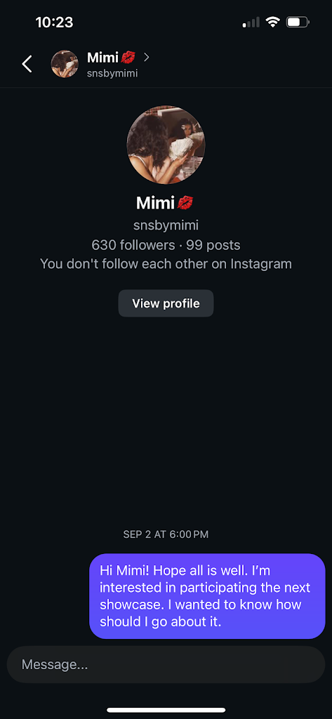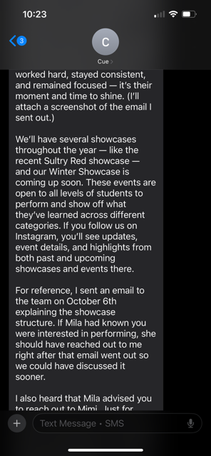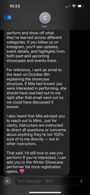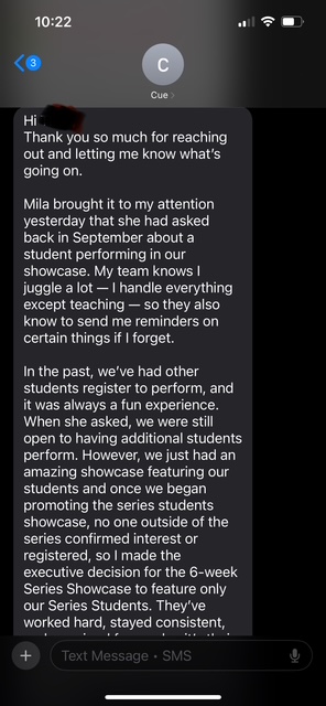 A week before the showcase, I was told I could not perform. I was devastated. When I asked Cue why, she claimed she didn’t know I was performing and that she was juggling a lot. But she absolutely knew—on the private session form, I clearly stated that I was preparing for the showcase, and Cue is the one who approves all private sessions.