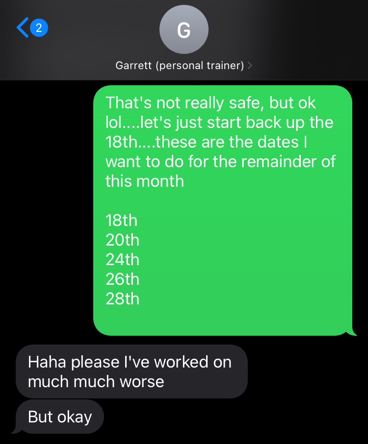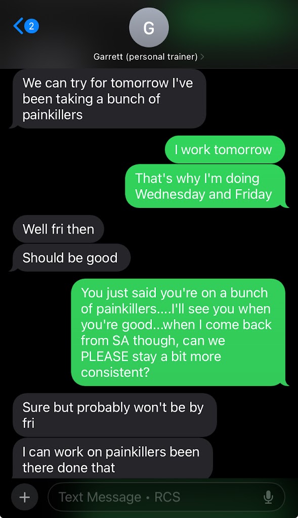 I originally paid Garrett for multiple sessions in advance and things great to start, but slowly things got worse and worse. He started missing sessions and when he would show up, he pushed me too hard. At one point I was gearing up to pick dates to have more sessions and he divulged that he’d been taking painkillers and that he’d “worked on much much worse.” We agreed on a payment plan to pay me back for the sessions that I no longer wanted due to his pill use. He neglected to pay me back and started to ignore me. When I tried to request again and he declined I gave the gym that claims him a review and he started to text me. At that point he even admitted to being on the pain meds once or twice….if he’s willing to admit for once or twice….how many is it actually?