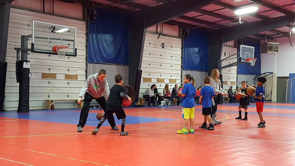 This basketball facility has 3 full-size courts and can be set up for volleyball. They also offer leagues. They do have bleachers all around the basketball courts. These are three step seating. Restrooms are upstairs.
