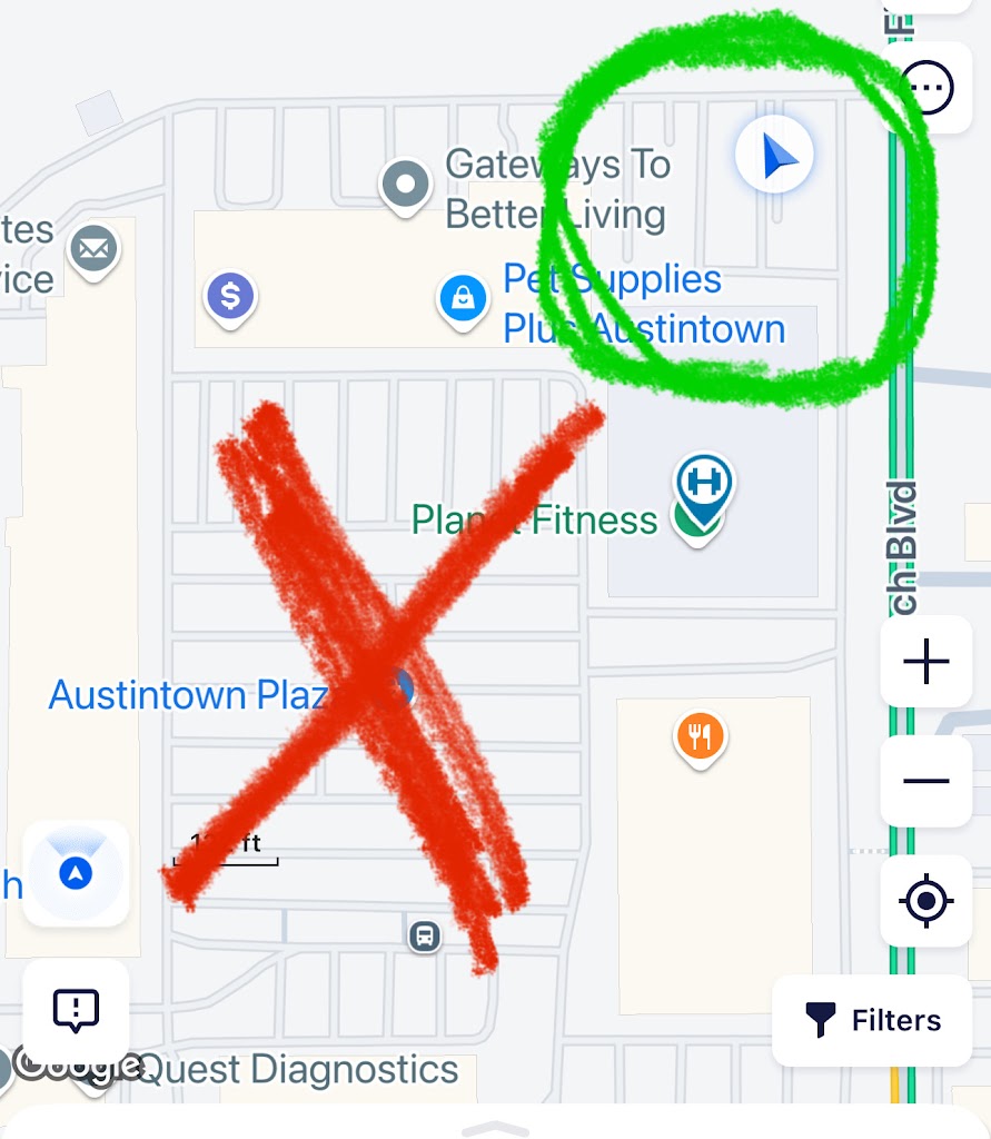 Enter from Fitch BLVD or Next to movie theater, and go around the buildings! Donโt go thru the front plaza, you wonโt have a good time.