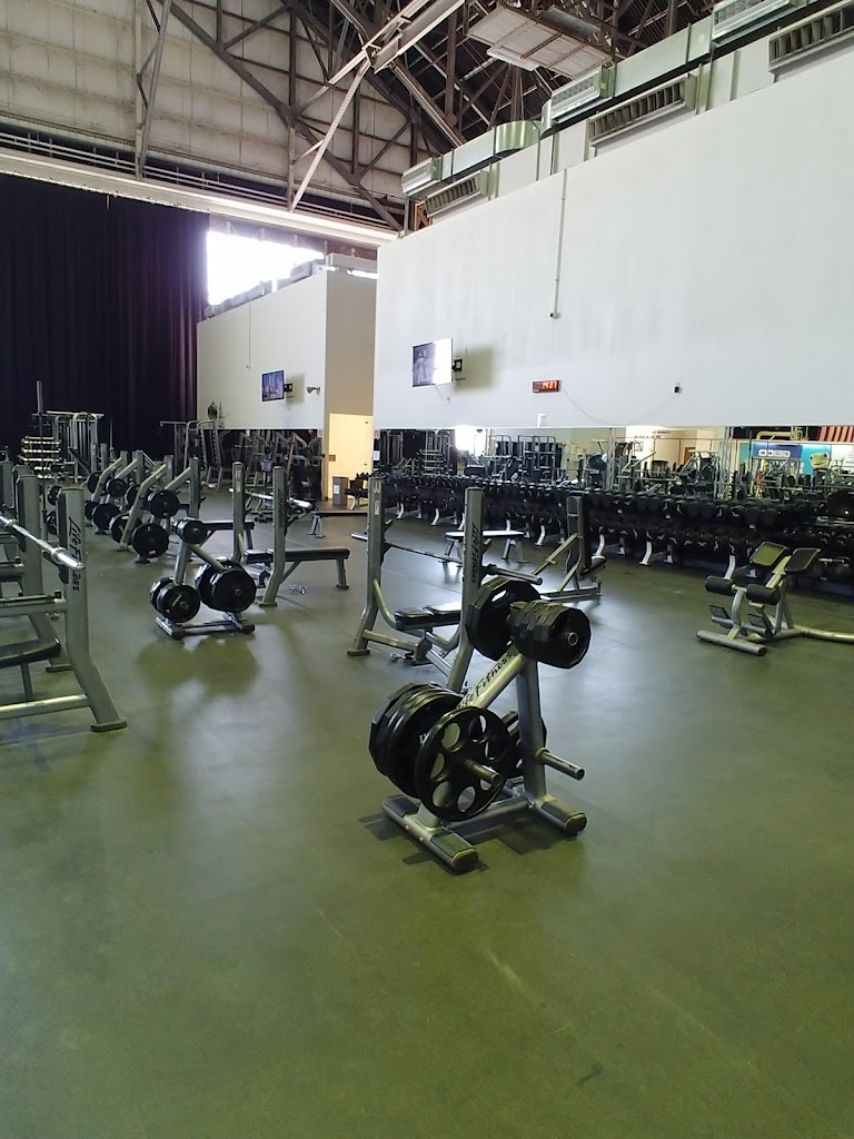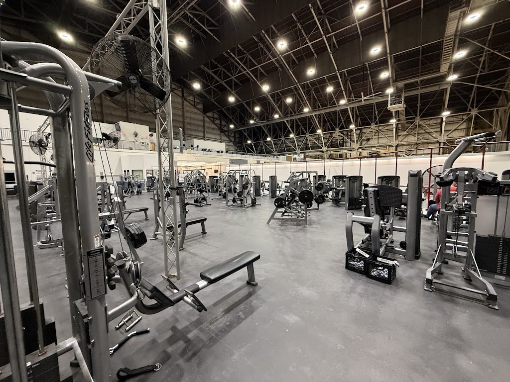 Indoor/Outdoor running track, a variety of cardio equipment, two basketball courts, a HUGE weight lifting section. DB up to 150lbs, 6 squat racks, 1 hacksquat, 1leg press, 2 cable machines downstairs and 1 upstairs, 4 flat barbell bench areas, 2 incline and 1 decline, and a good variety of different machines to hit all muscle groups. This is not everything but I realized how long of a list that will be. If you have access to come on base, I highly recommend this gym!