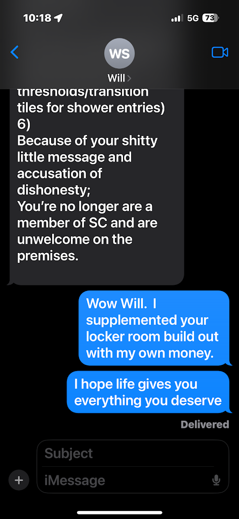 Disappointed in the owner. The gym is decent and convenient but the owner, Will Sperry, really disappointed me. I paid for a year up front cash because he promised me “13th month free” for paying up front cash. When it came time to renew, I reminded him and he told me no he didn’t promise that. It was verbal so I let it go.