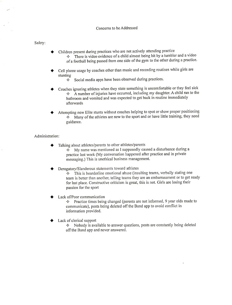 In the end, I asked to privately speak to the coaches to address some of these concerns (see photo for details.) I barely made it through the 2nd safety bullet point when I was completely dismissed. I was told if I did not like it, I should leave. Ultimately my daughter's safety and wellbeing is my first priority. I want her to be surrounded by coaches who encourage her to push herself and excel at her goals. I want her to be recognized when she does something right and positively corrected when she can improve. It is unfortunate some of the coaching staff does not reflect the same views. Because of this, I had to make the decision to remove her from the program.