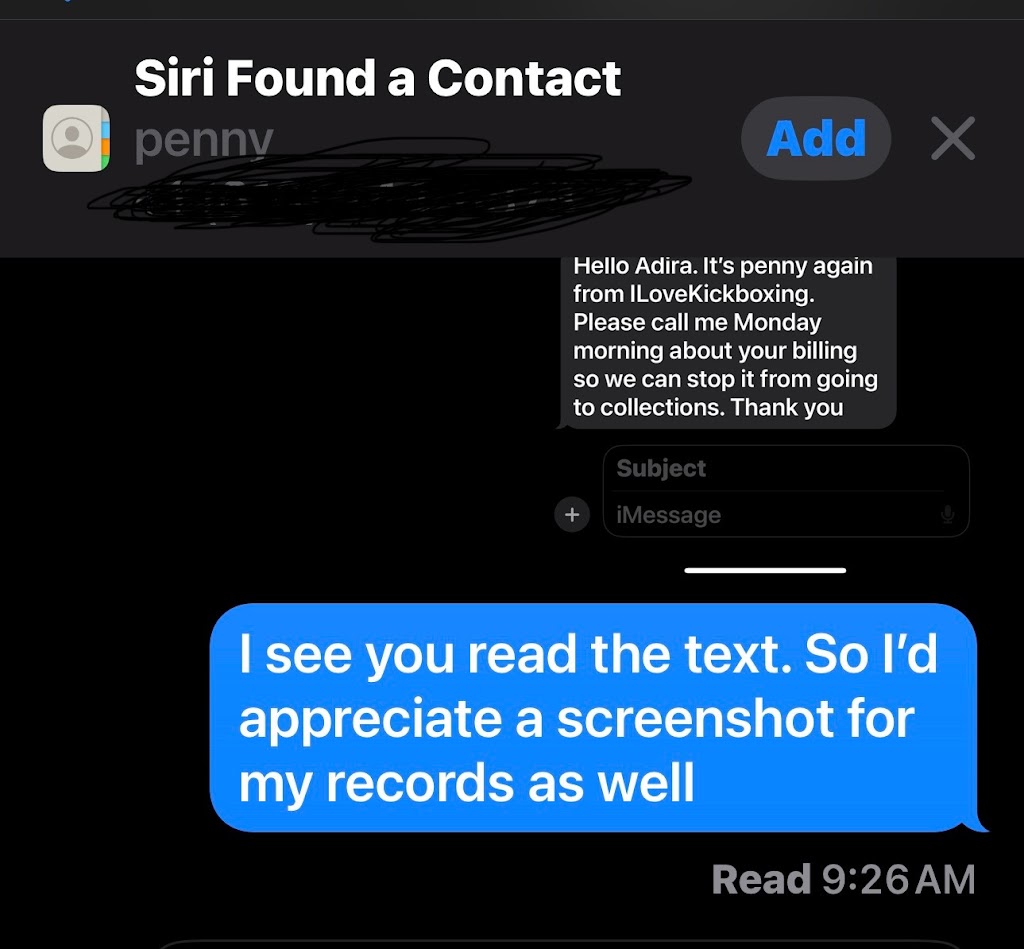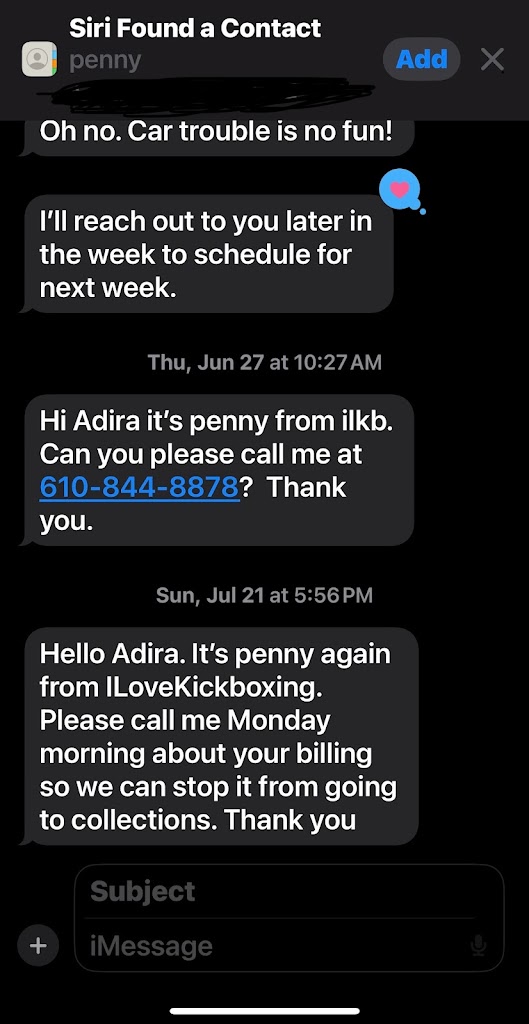 I forgot the notice had to be emailed and penny scoffed and continued to talk to me in a condescending tone saying “if you read the contract you would know that you can’t give notice unless it’s email”, I agreed with Penny trying to diffuse the situation and Penny continued to yell and threatened to send my account to collections even though I was on the phone trying to resolve the issue in spite of the disrespect I was encountering . I honestly don’t care about the membership or it being sent to collections because I’ll pay it before it gets on my credit. What upset me the MOST aside from her insolent attitude is when Penny started lying saying I replied to a text she sent back in June. When I sent a screenshot SHOWING that I never replied to the text and requested one back showing where I replied to her Penny then decided the conversation was over, I also gave her the exact date of when I called her back in July and left a voicemail to return my call at which Penny hung up on me. I don’t need anyone to reach out or anything of that sort because I made it clear to Penny that I’m not at all interested in returning at which she made a pointless comment saying I wasn’t welcomed back. I just want to share my experience even though I know nothing will be resolved from this, hopefully it’ll be a learning experience. It was a simple situation that could have been easily resolved had Penny’s ego not hampered the conversation.