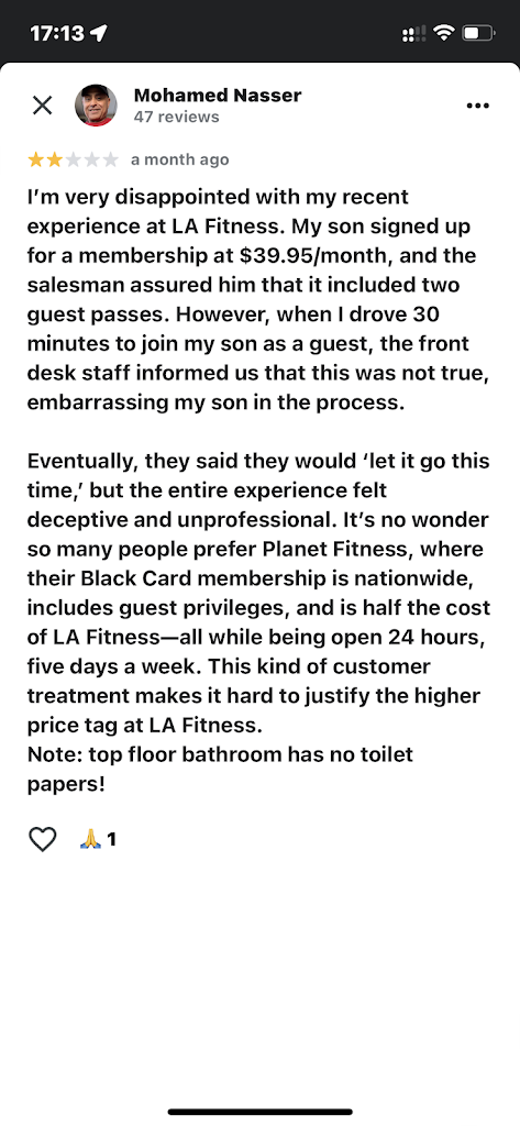 Had a great experience at LA Fitness in SouthSiders works. Assistant manager Shae took care of me and made sure all of my needs were met. Thank you!