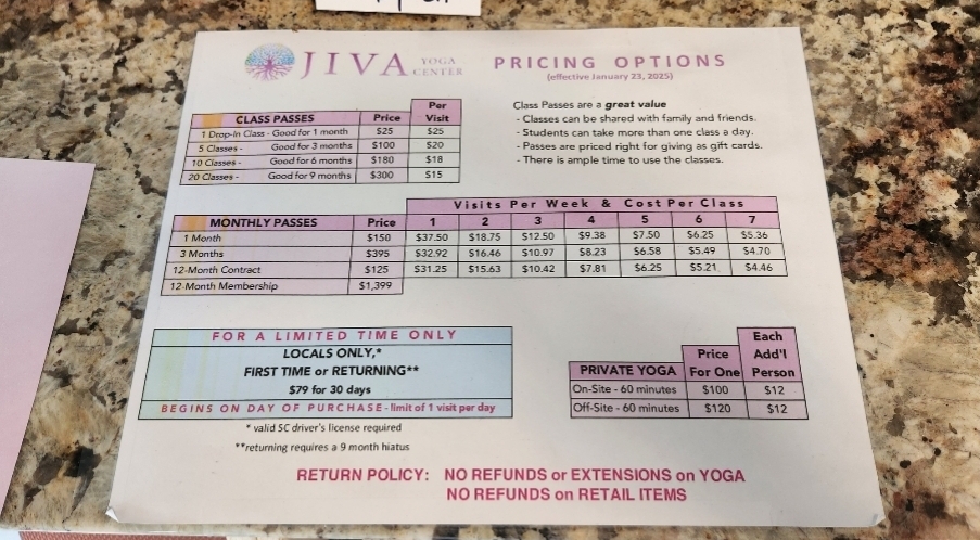 Husband and I had a great experience at Jiva during our recent vacation. They were very welcoming, the staff and other class attendees. I would recommend it for residents and visitors. We will be back.