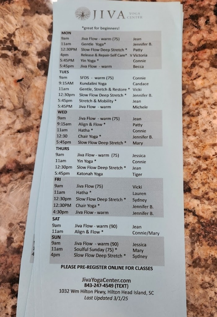 Jiva has wonderful class options , from beginning to very advanced . The instructors are fantastic. Always a highlight for me when staying in Hilton Head!