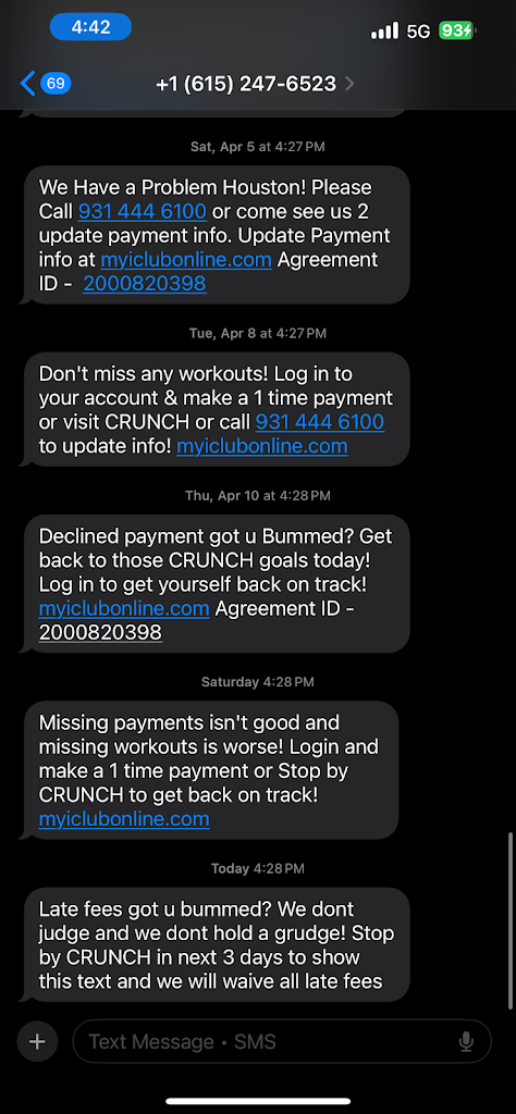 Tried to cancel my membership after 5 months. They want me to sign a document saying I owe another payment. That isn't going to happen. I will turn this over the TN state attorneys office and JAG for bad business practices. Always use auto generated credit card when dealing with Crunch Fitness.