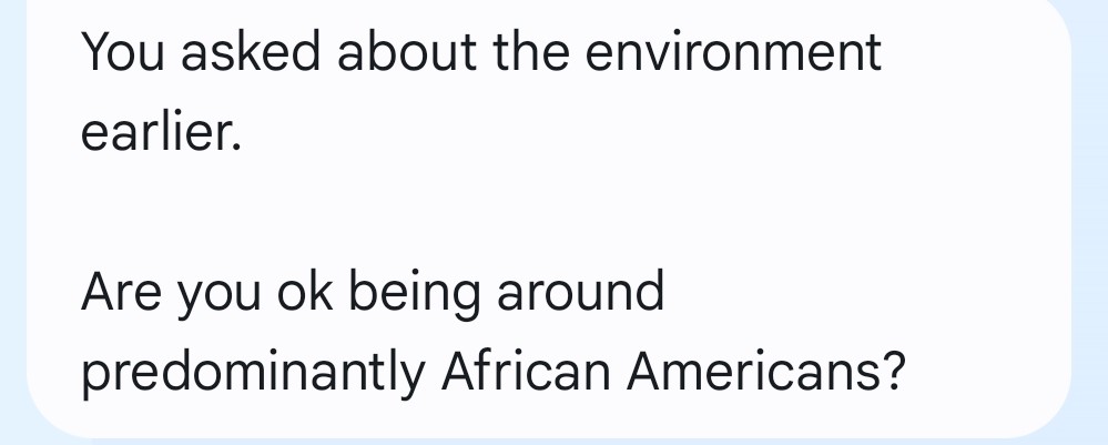 While searching for a local gym, I thought this location had potential for myself as a new client. However, this definitely proved not to be true. A Personal Trainer that claims to be a "Lab brand ambassador" sent the attached screenshot in regards to the race of people who receive services within this establishment. In attending different gym facilities throughout my life, I have never had race brought up as a determining factor. Neither should I be forced into a situation to explain how I am not a racist individual. Individuals that seem to be this concerned about others races, especially when conducting business, should not be employed, much less be a "brand ambassador". Due to this unfortunate interaction, I have zero interest in conducting any further business in an environment that I am discriminated against due to a factor out of my control.