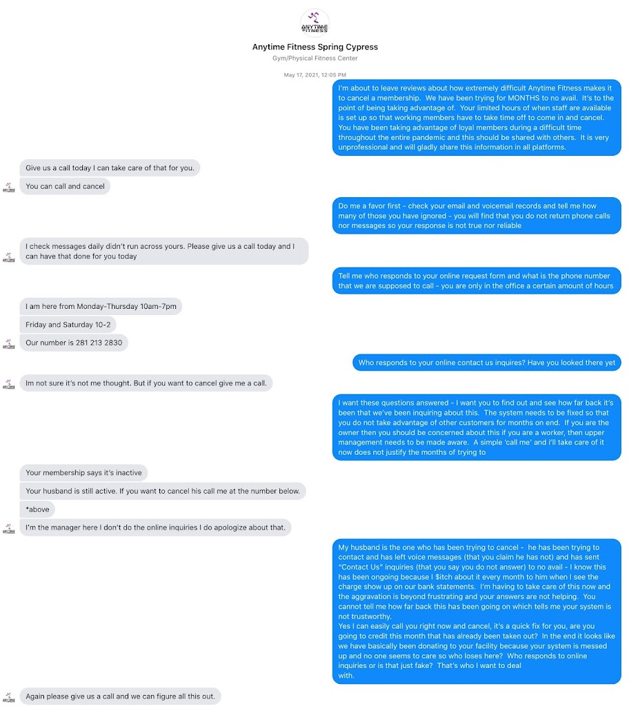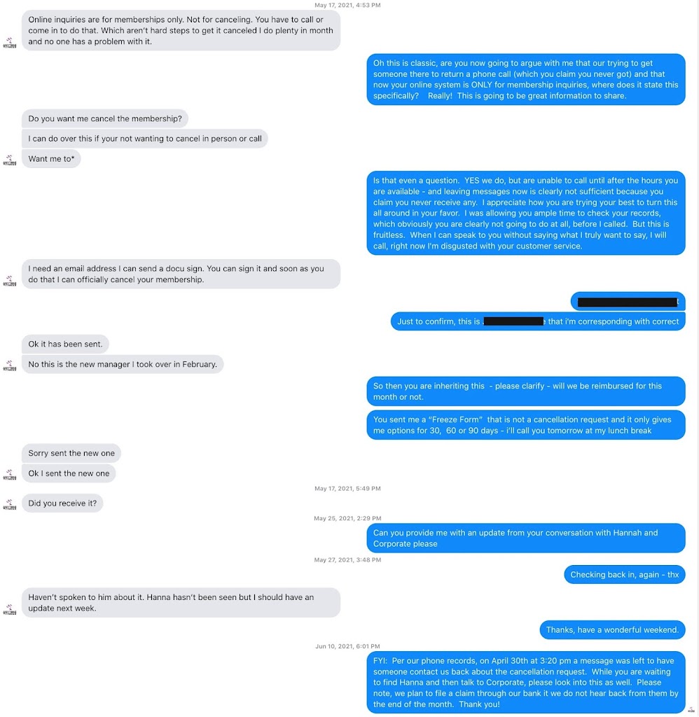 My husband and I have been trying to cancel his membership for months and have been unsuccessful. We call during βstaffed hoursβ, leave voice messages that never get returned, and go in during staffed hours yet no one greets us or is at the office. Does anyone work here?