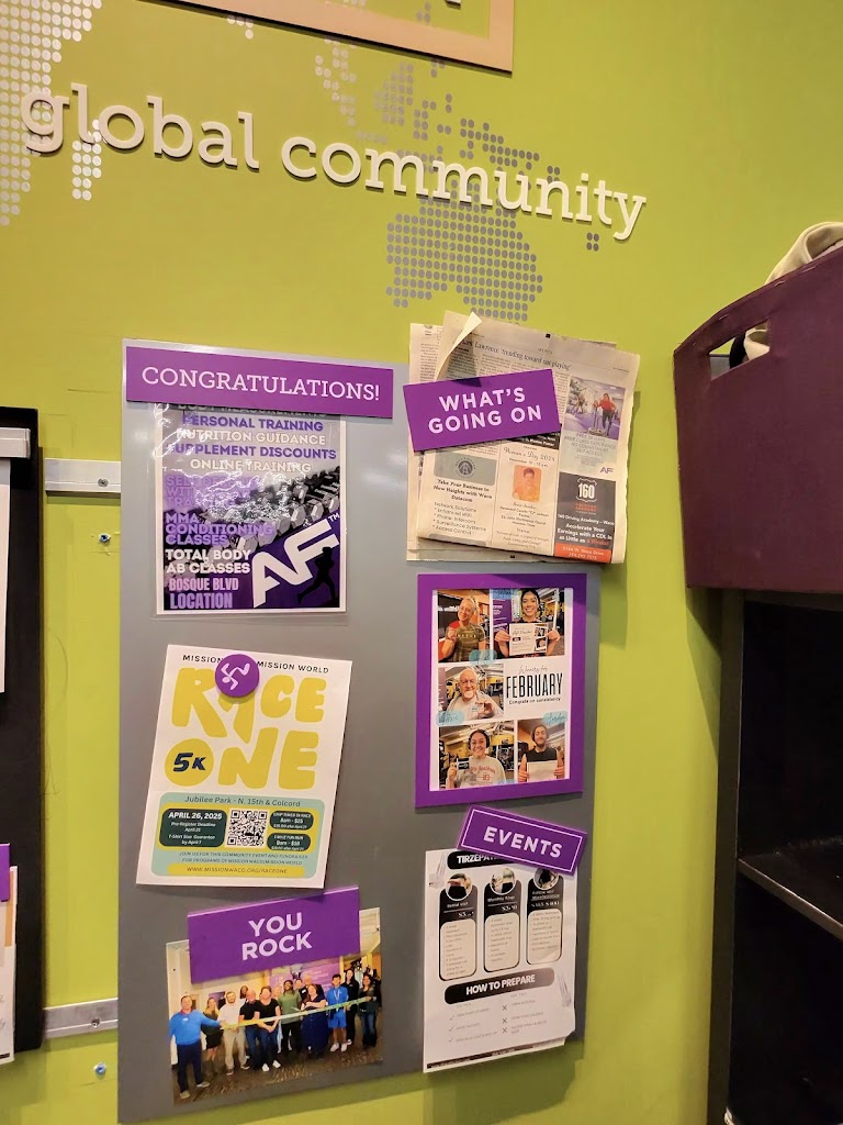 The gym layout is practical: cardio to the left as you enter, and straight ahead thereβs a large selection of weight machines, free weights, and a studio. Community involvement is strong, with challenges, extra classes, and employee highlights. Thereβs even a wall photo celebrating what looks like a recent grand opening, focusing on the owner and staff.