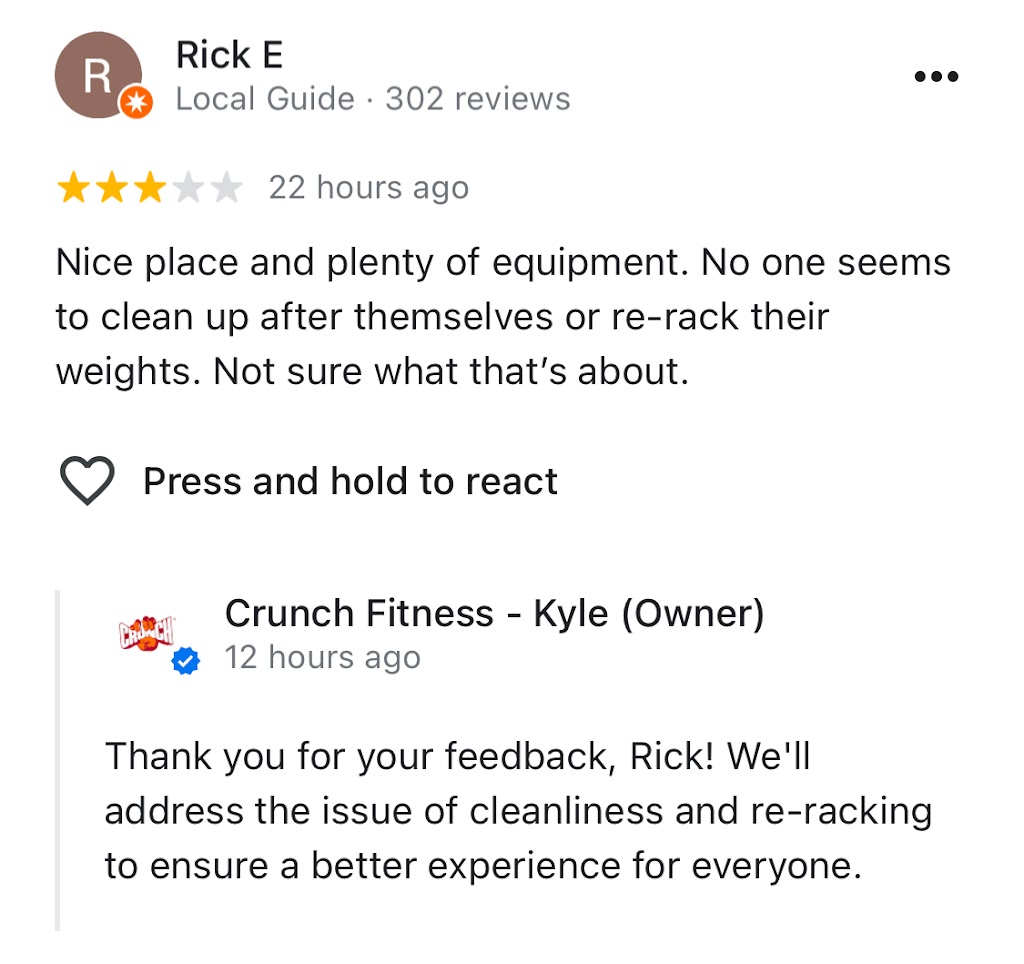 I may be one of the few low-star reviews now, but trust me, this arrogance will catch up to them. Crunch might seem great when they’re chasing you to sign up, but once they hit their target audience, their attitude shifts. I live nearby, but with staff this unprofessional, I’ll never go back.