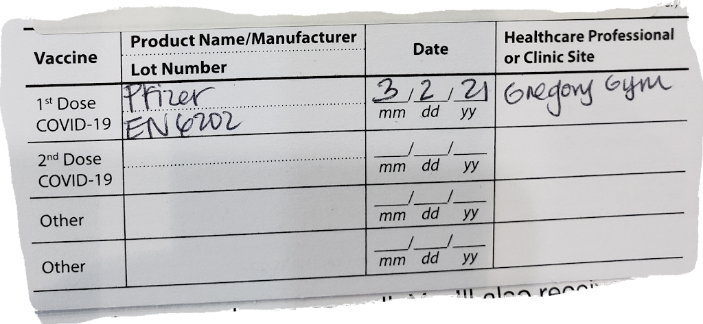 We went for our second vaccines at Gregory Gym Wednesday, March 3rd. UT provided shuttle service for those needing assistance. Volunteers and staff directed us to accessible entrances and elevators. The check-in process went smoothly and vaccination stations were readily available. UT Health did an excellent job setting up Gregory Gym for the vaccination process. We travelled from San Antonio to Austin for both vaccines. Thanks to UT Health and Gregory Gym!!