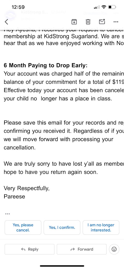 There was some miscommunication at the beginning from the presale, not communicating the opening and classes starting and being charged. We were able to reach an agreement. Aside from that, our 4 year old daughter really likes going to Kid Strong. Her favorite are Coach Liz and Coach Mimi.