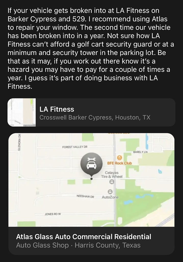 If your vehicle gets broken into at LA Fitness on Barker Cypress and 529. I recommend using Atlas to repair your window. The second time our vehicle has been broken into in a year. Not sure how LA Fitness can't afford a golf cart security guard or at a minimum and security tower in the parking lot. Be that as it may, if you work out there know it's a hazard you may have to pay for a couple of times a year. I guess it's part of doing business with LA Fitness.