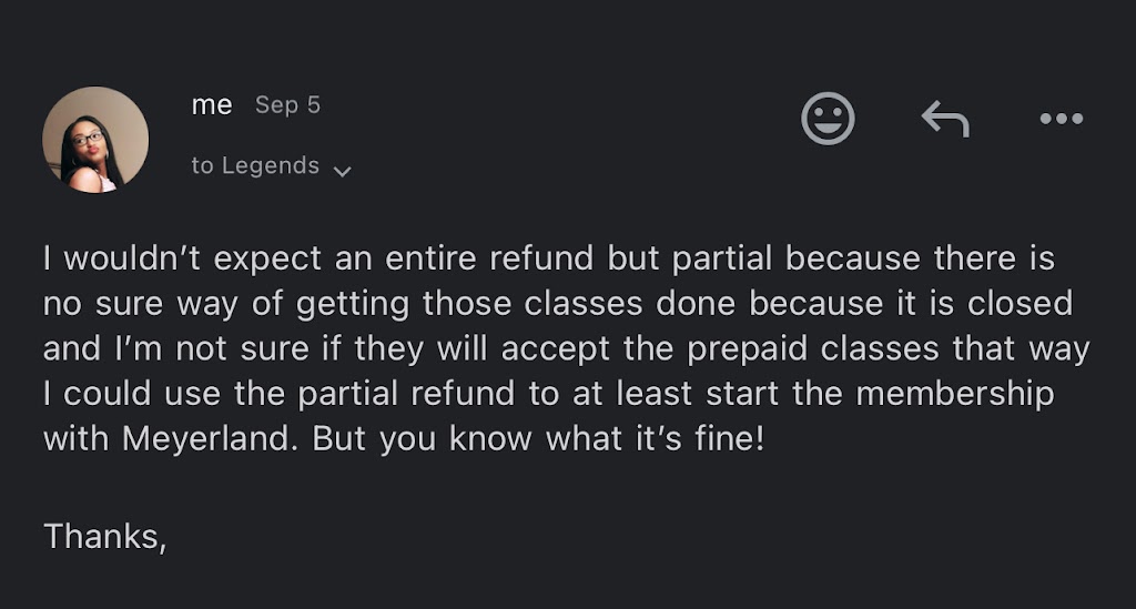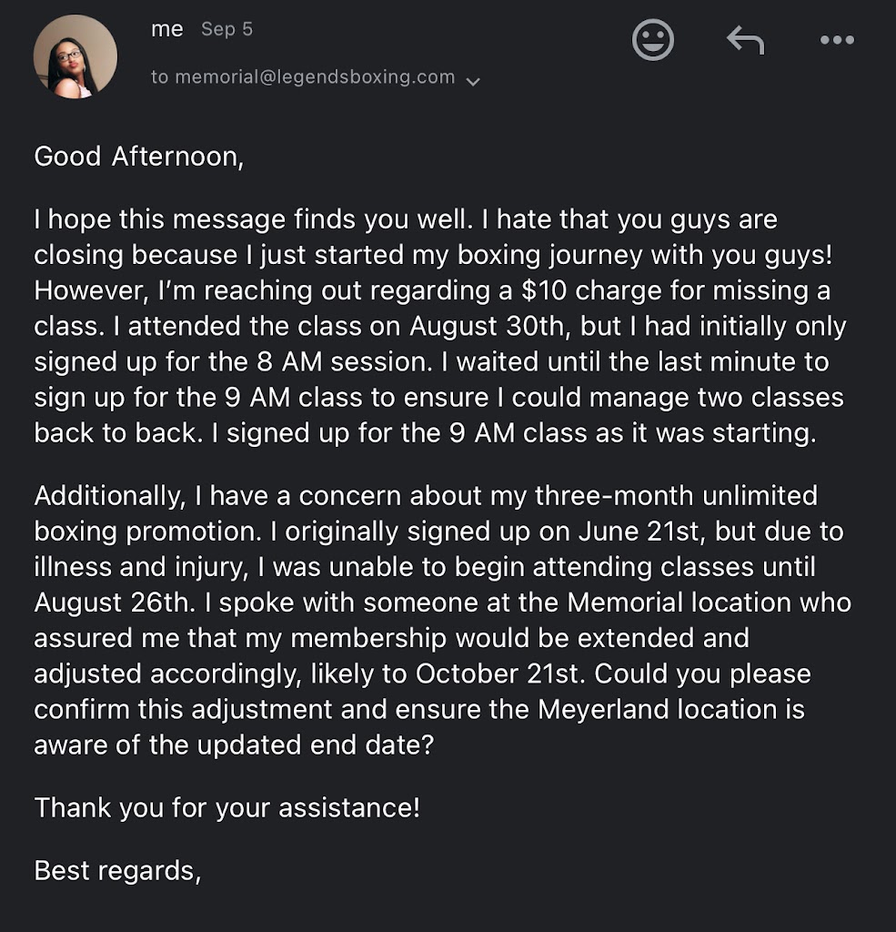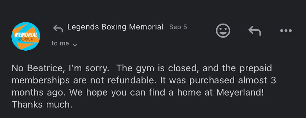 I want to share my experience with the Legends Boxing gym in Memorial, which recently closed. I signed up for a three-month promotion on June 21st for $365. Unfortunately, shortly after, I got sick and couldn't attend any classes for about a month. When I returned on August 26th, I asked the coaches for an extension due to my illness. I attended a few classes at the end of August, only to find out the gym was closing, and we were given the option to continue at the Meyerland location via email.