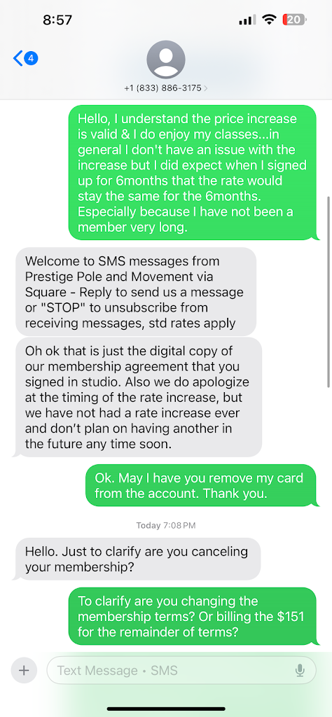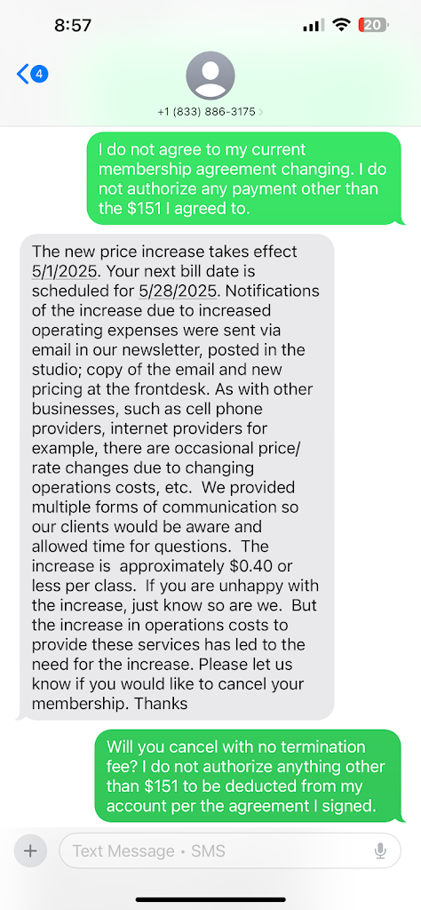 Added: Look at the lies in the response. You can clearly see how the interaction transpired. You can also see how they were prepared to charge me the increase the following month. Hence my reason for requesting my payment removal. DO NOT BOOK CLASSES HERE!