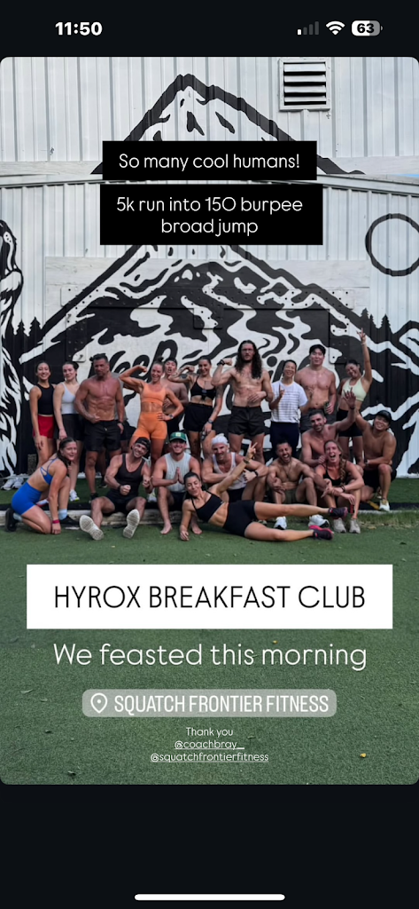 Bray’s Saturday morning Hyrox class I don’t miss. I love it! Great vibes. Great community. Great workout. Love Squatch!