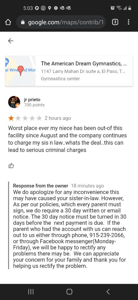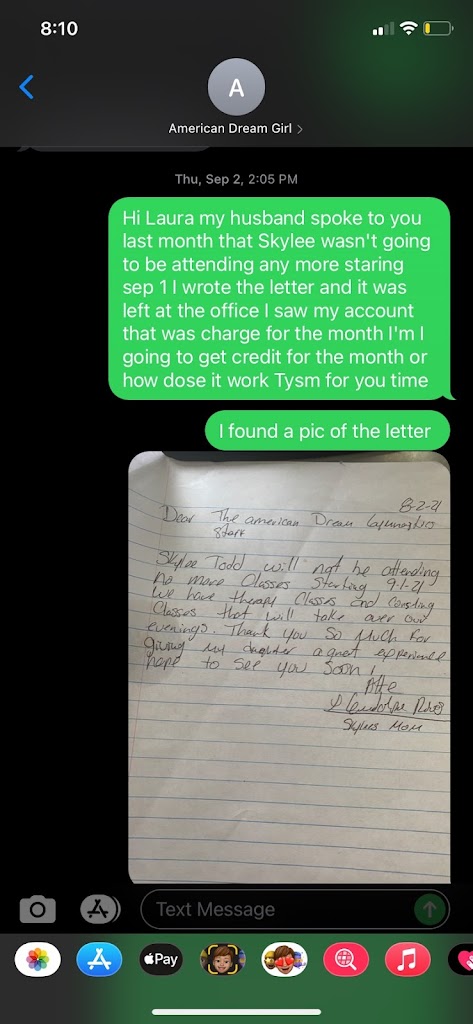This place been the worse place I disenrolled my daughter in writing on 8-2-21 and to this point m still getting charge I been calling and tx #9152362066and they never answer or call me back I just don’t understand why they do have time to respond to a rewiew and they don’t have the ethnic to respond to the customer I’m even providing pic and info like in your respond I hope you do refund every cent you been charging without my authorization
