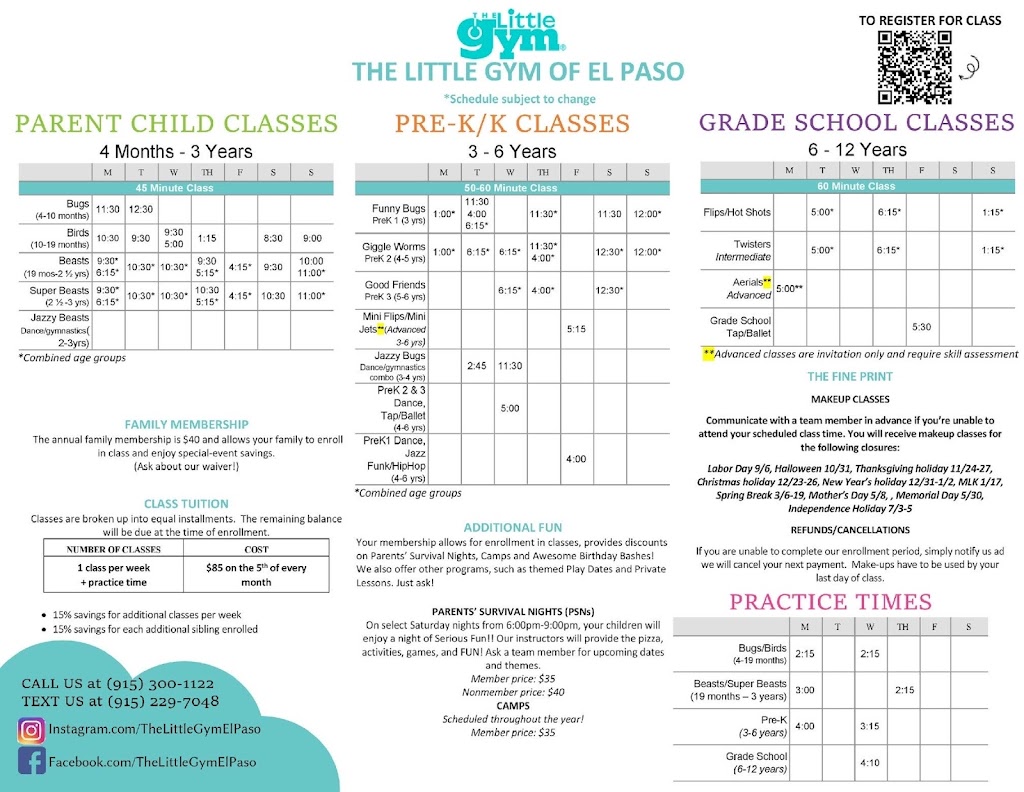 The Little Gym of El Paso is the worlds premiere enrichment and physical development center for kids 4 months through 12 years. Our trained instructors nurture happy, confident kids through a range of non-competitive programs including parent/child classes, gymnastics plus enjoyable extras like camps, Parents Survival Nights and Awesome Birthday Bashes. Each week, progressively structured classes and a positive learning environment create opportunities for your child to try new things and build self-confidence, all with a grin that stretches from ear to ear.