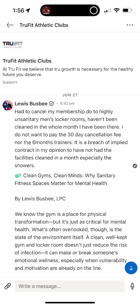 This gym is horribly disgusting, the showers were not cleaned for a month and are likely still not cleaned. I cancelled my membership due to that after repeatedly telling staff and management and showing visual proof of same trash in shower daily for the month I was there. They promised to clean immediately each time but the next day it was always worse with the same piece of gum wrapper in the same shower and increasingly more disgusting. ( reply to TruFit response to this post) I already did and have discussed this thoroughly with TruFit on many post , in person conversations, emails, reaching corporate, etc) requested to be let out of my contract because of catching a foot fungus, all smoke and mirrors with this company, still charging me. Never fixed the problem, likely not ever going to #smoke, mirrors, lies, and false appeasement)