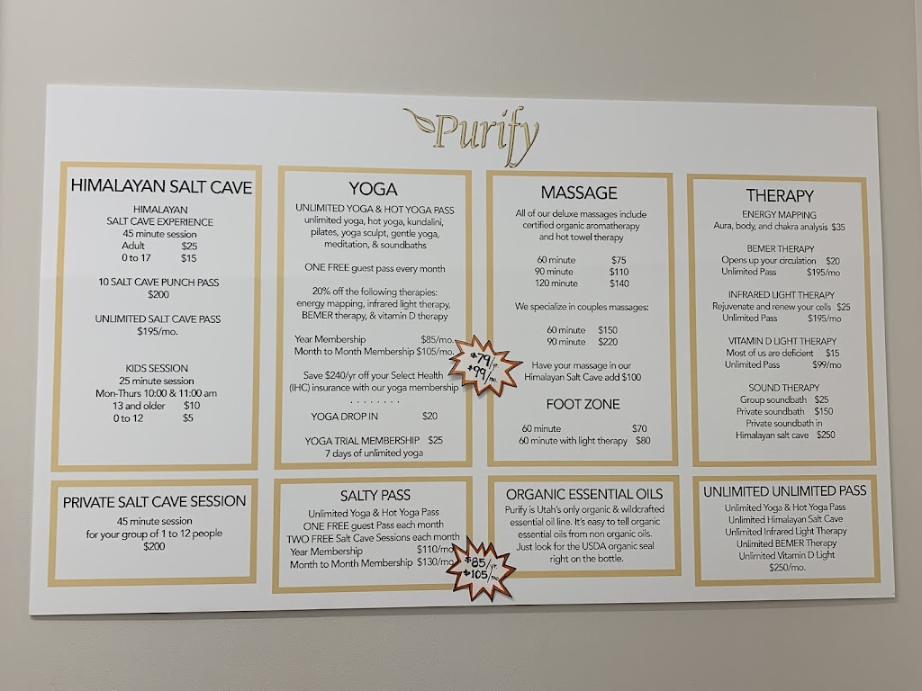 10 stars if I could. Purify is stellar. Check their website for all the workshops and events, and come weekly to yoga, the salt cave, energy mapping, Beamer, light therapy, massage, real organic essential oils, and some of the best people to help your health in Utah. You will be grateful for the high quality TRUE wellness waiting for you here. I am.