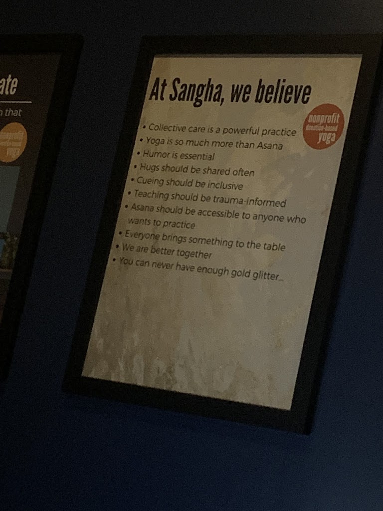 I could never do Sangha justice with words. Thank you for creating a space of safety, love, accessibility, social justice, and of course community. The classes — and just the four walls — at Sangha have reliably grounded me and allowed me to feel present in my body through the years, even during really difficult times. One of my favorite places on earth, no exaggeration! 💫🫶
