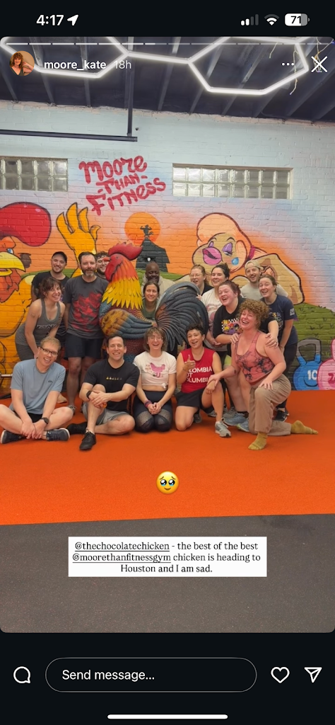 I'm not a gym person really. I've belonged to 4 different gym/exercise facilities in Richmond over the years and I went into the gym part as little as possible. At Moore than Fitness, the chickens and the murals and the re-purposed gas station set the vibe the second I walked in. The way that Russell listened to me when we met, and the fact that my personal trainer comes up with fun and sometimes funky exercises lets me be comfortable being my authentic self. We laugh, we discuss what hurts, we talk about fitness goals- even the absurd ones. And I trust that my trainer is watching and listening carefully to make sure I am safe and I am making progress. I see improvement after 2 weeks, and I can imagine a future where my sixty-plus , full-figure body is doing the things that are important to me again.