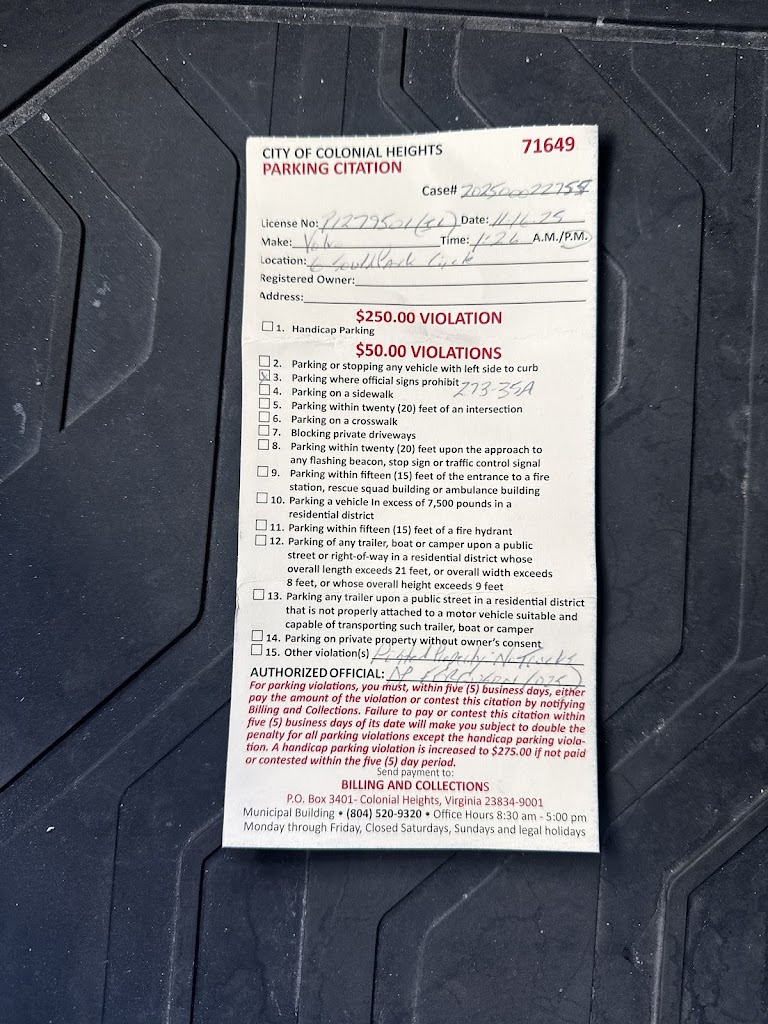 the colonial HTS police department has started ticketing parked truck at the mall parking lot.