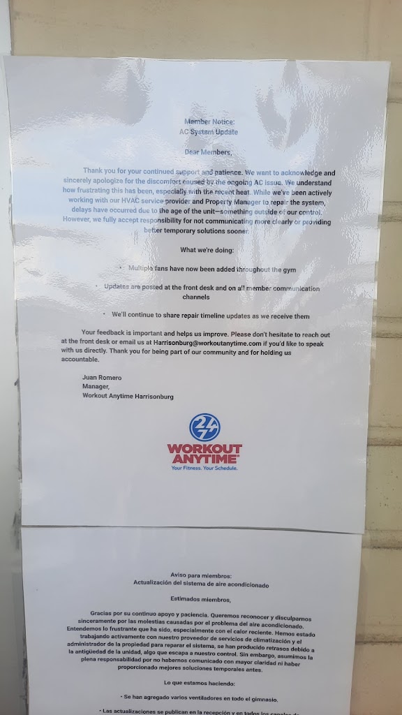 If you live in Harrisonburg, this 24/7 gym has all the essentials to get in a good pump. The staff are always helpful. The A/C was down/ not working well for a while. They added two more fans after I left a review of 2 stars because of how miserable the temperature was inside. They also posted an update to the community on the outside of the gym and at the front desk letting us know what is wrong and claiming to keep us updated on how the issue will hopefully be resolved in the months to come. I came back from vacation, and it felt pretty cool inside with the added fans that I had better sustained energy to get through my workout. Join workout anytime today!