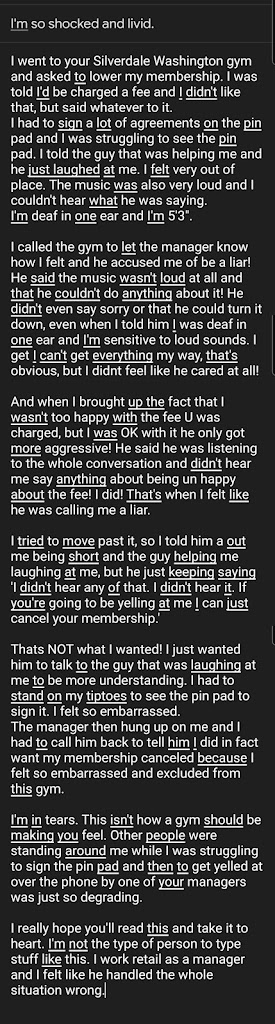 The trainer who made fun of me during my work out no longer works here so I’m happy with the business again.